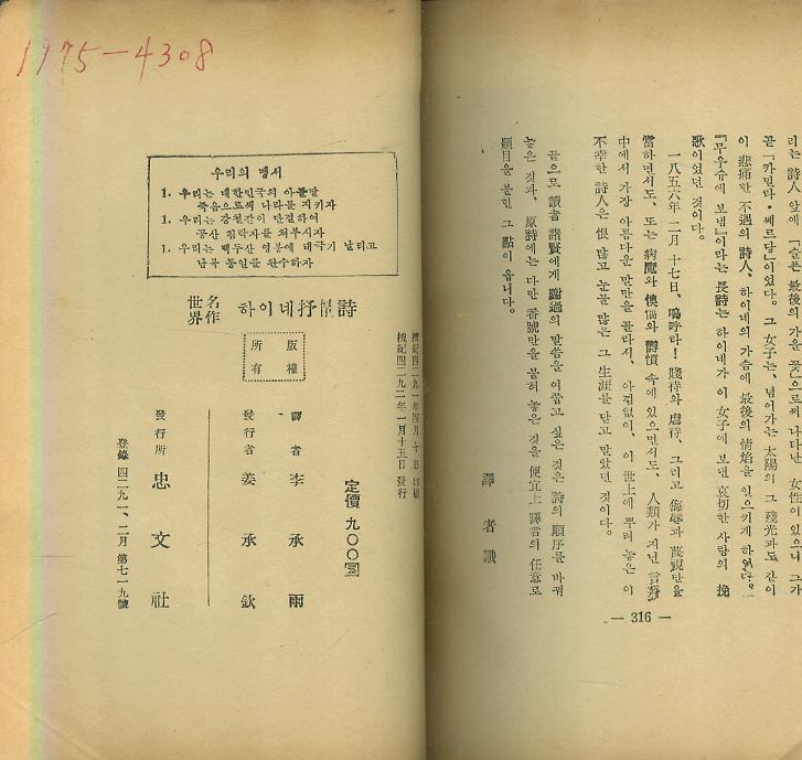 ÇÏÀÌ³× ãÌ // ÀÌ½Â¿ì æ» : ¼¼°è¸íÀÛ -- ÇÏÀÌ³× ¼­Á¤½Ã(ßñï×ãÌ) (Ãæ¹®»ç 1959³â ÃÊÆÇ)