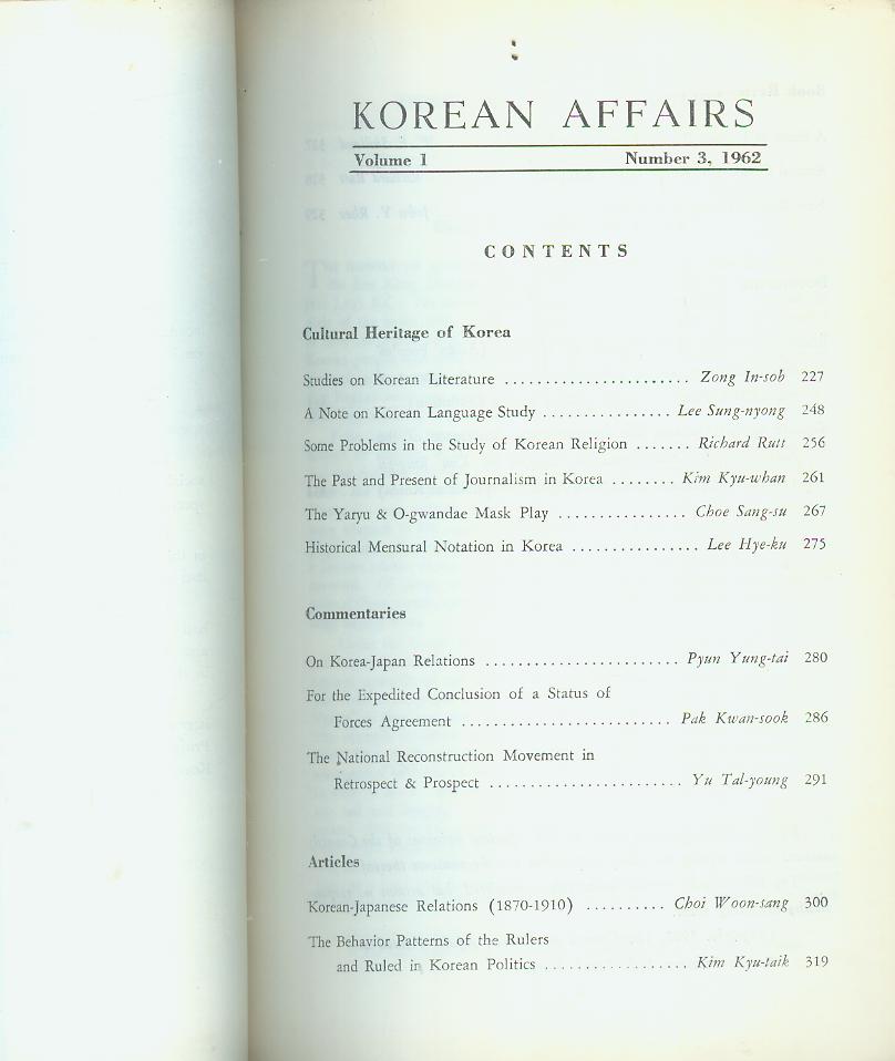 1962³â ¹ßÇàµÈ Çѱ¹°ü°è ¿µ¹® ÇмúÁö  ' Korean Affairs (Vol.2) Ã¢°£3È£ ÀÔ´Ï´Ù.