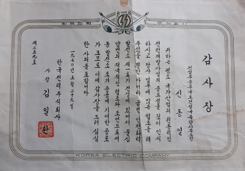 1970³â Çѱ¹Àü·Â ±èÀÏȯ »çÀåÀÌ °Ç¼³ºÎ Áߺα¹Åä°Ç¼³±¹ ÃàÇ׻繫¼ÒÀå ½Åµ¿¿­ ¾¾¿¡°Ô ÁØ °¨»çÀåÀÔ´Ï´Ù.